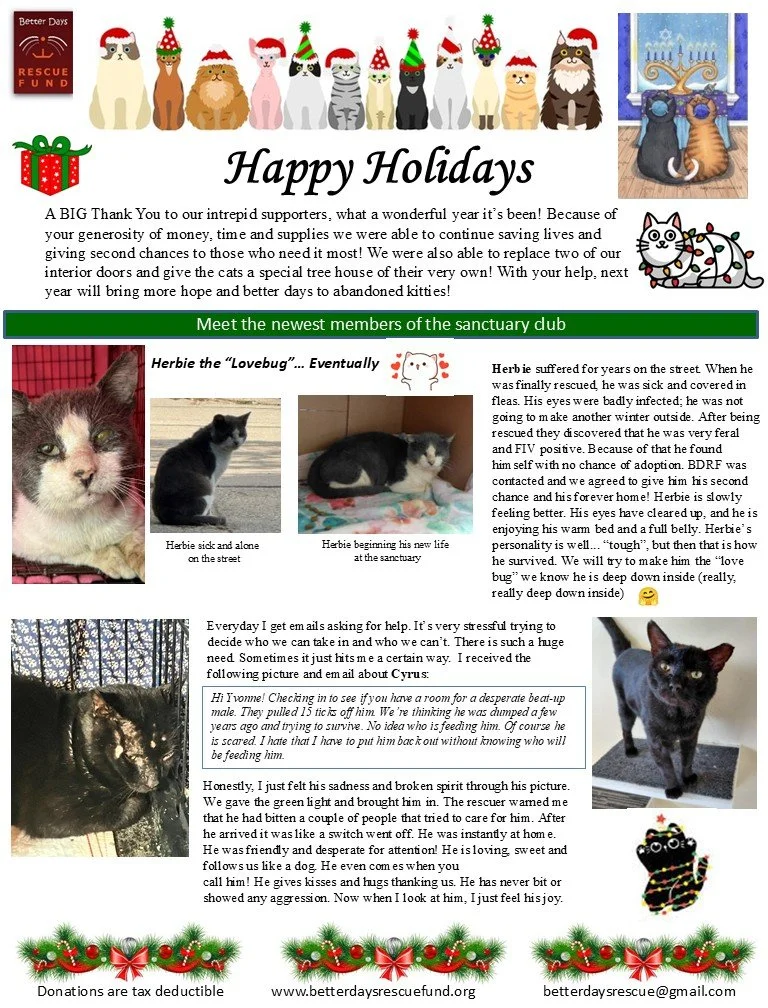 We also send 2 or 3 mailings per year via the post office. Click the picture below to read a pdf of our 2024 Holiday Letter. If you would like to receive our postal mailings, email your address to betterdaysrescue@gmail.com