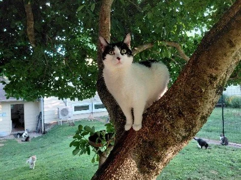 Barry came to us from a fellow rescuer. As a kitten he had been taken in by an elderly man. This man truly saved his life. He never would have survived with his birth defects. One of his back legs is missing the foot and the other back leg is deformed. Unfortunately, the man had to go into a nursing home. His son came to the house and put Barry out on the street!!! It’s inconceivable how someone could be so heartless. Lucky for Barry the neighbor saw him out on his own, trapped him and brought him to safety. He doesn’t let his different legs slow him down. He is always on the move!!